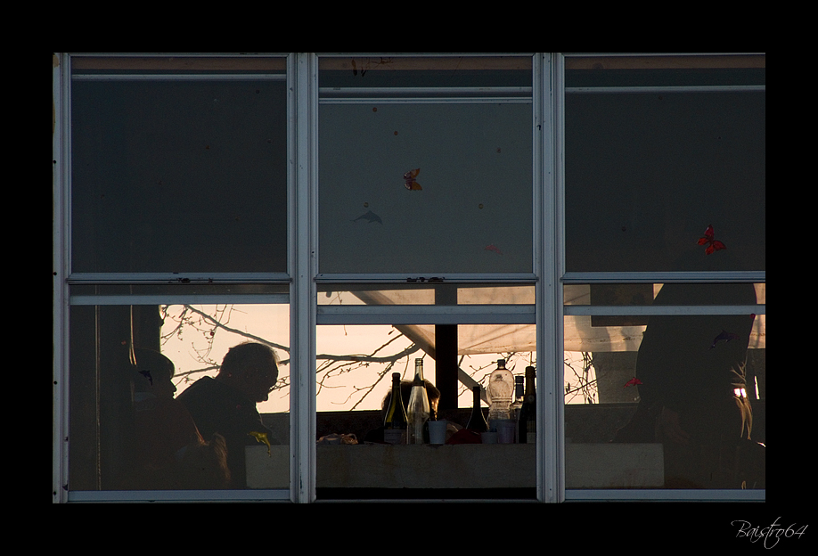 Pero' se non leggo il titolo vedo uno scorcio di stanza con delle persone di cui una tagliata e l'altra nascosta dietro delle bottiglie apparentemente hanno finito di mangiare ma nulla che mi contestualizza lo scatto se non appunto il titolo.
