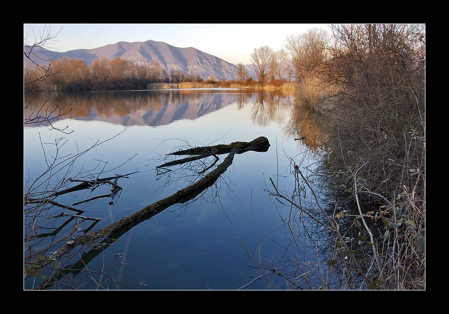 Scherzi a parte, mi piace molto il rapporto che si crea tra la vita (seppur sopita dall'inverno) degli alberi sulla riva e ciò che resta dell'albero.