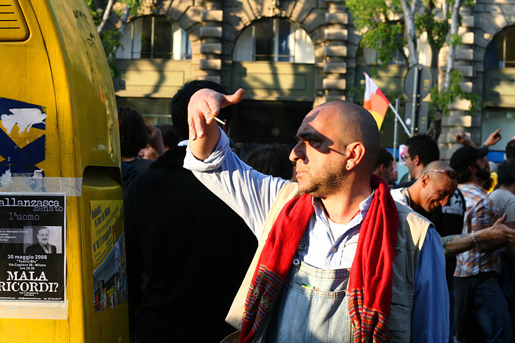 Mi piace il gesto e soprattutto la luce che cade sull'uomo... meno invece il cassonetto a sinistra che non mi pare partecipare alla storia; allora propenderei per un taglio più stretto (magari quadrato) che lo elimini, oppure più largo che lo renda meno protagonista: le scritte catalizzano molto l'attenzione.