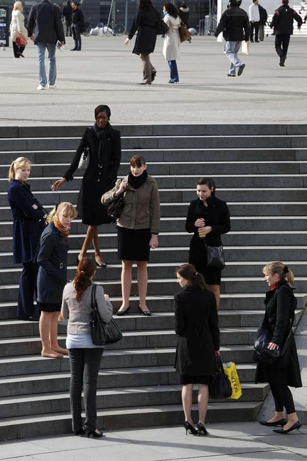 La parte sopra mi fa pensare: da un lato contestualizza l'azione principale, dall'altro distrae: alla fine la cosa che mi piace di più sarebbe un taglio circa all'altezza delle ginocchia dell'uomo in jeans a sinistra.
