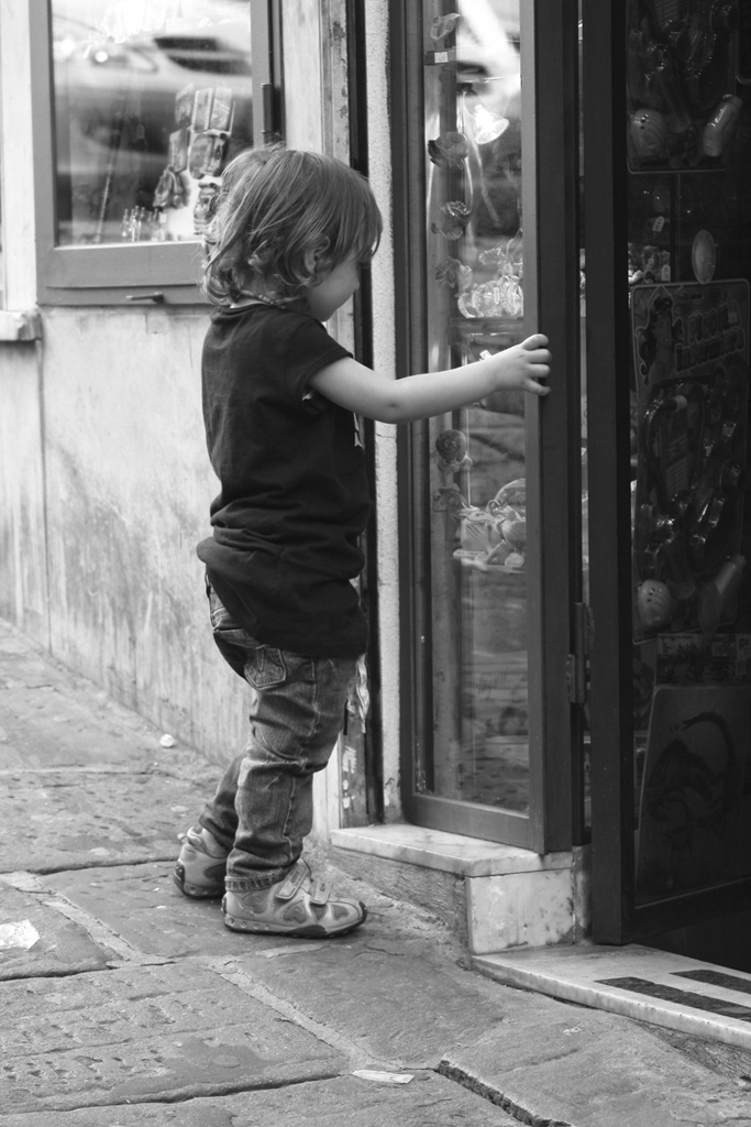 Ke bella qesta bimba ke si aggrappa con tanta forza alla vetrinetta dei gioccatoli, indecisa, curiosa di fronte a quel portale dei propri sogni..