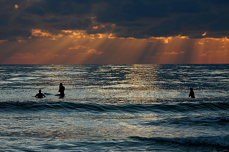 Credo che la forza di questa foto sia il riflesso della luce sulle onde che si contrappone ai bagnanti in cotroluce, davvero bellissima!