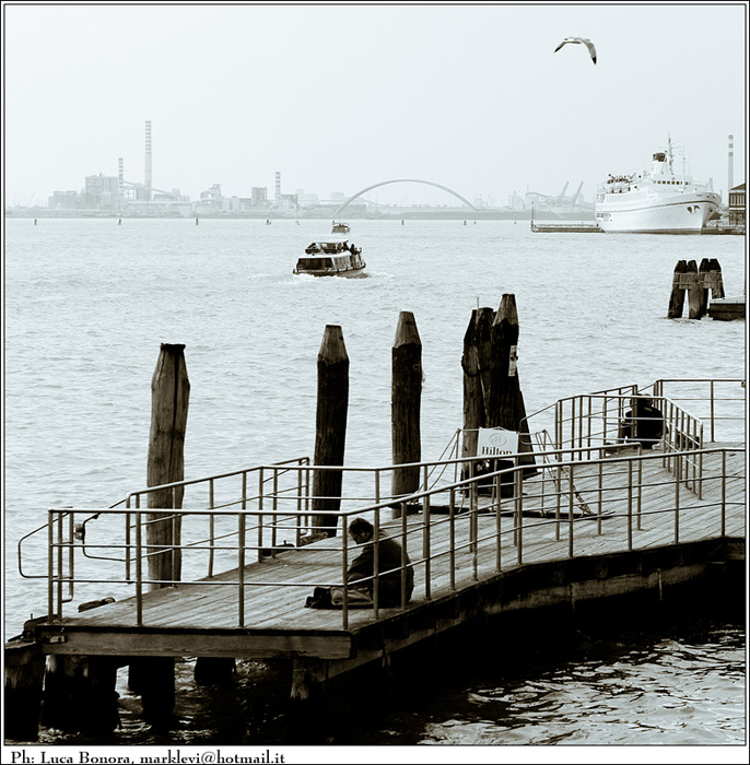 A fargli compagnia, i piloni di legno, inanimati, e il rumore delle onde che probabilmente nemmeno sente.
