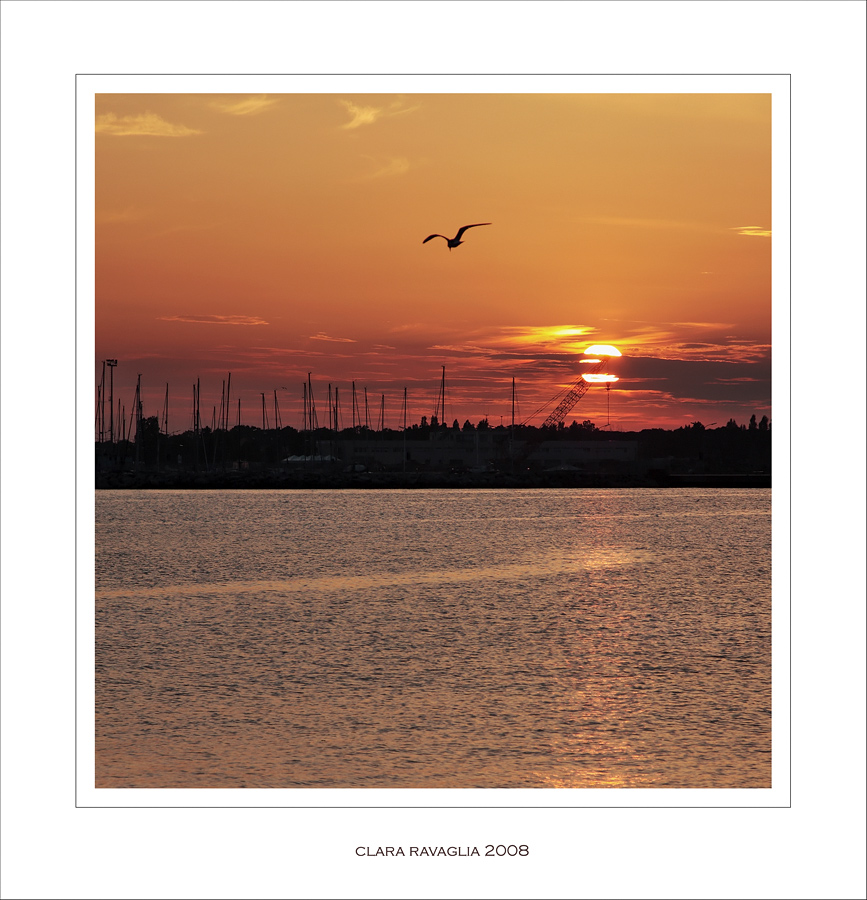il taglio quadrato fa concentrare l'attenzione visiva sul volo del gabbiano e sul sole al tramonto. bella la silhuette degli alberi e della gru che si perde nel sole. colori e luce molto buoni.