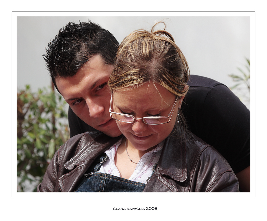 Mi piace lo sguardo di lui, ...quasi teatrale, ...quasi consapevolmente in posa ....eppure schietto, sincero, “innamorato”: in bilico tra l’ironia dell’atteggiamento ed un franco senso di protezione che coccola ed abbraccia. Mi piace lo sguardo di lei ...basso, ricco di suggestioni intime e segrete carezzate da un sorriso sereno che pennella lo scatto di forza evocativa.
