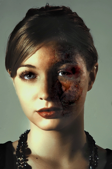 premetto: non capisco nulla di fotoritocco,.. ma ho visto un sacco di film, splatter ed horror, e credo che i capelli debbano essere bruciacchiati e arricciati, in certi punti si dovrebbe vedere la cute, e non schiariti,...eppoi l'okkio dx (x chi legge)dovrebbe risentire di vascolarizzazione accentuata, nonchè sprovvisto di ciglia.