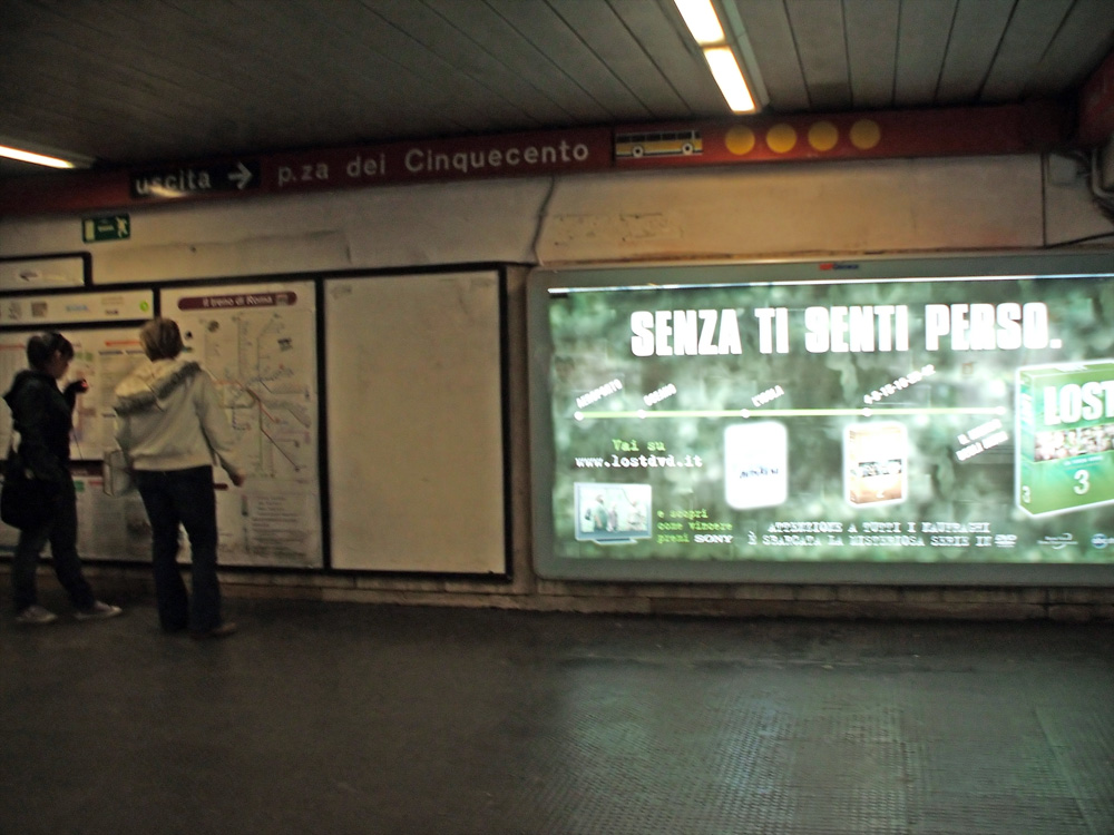 Posizione più scomoda non poteva esserci, i cartelloni erano proprio avanti i tornelli dell'uscita della metro e inoltre qusti maledetti cambiavano continuamente pubblicità, trovare il momento giusto per scattare non è stato affatto facile. Purtroppo li hanno cambiati quindi niente seconda chance.