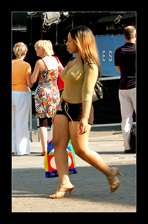 In merito alla tua domanda,penso che avendo ristretto il campo solo sul soggetto principale si sia persa la situazione reale del momento.Il luogo era una piazza di Montreal e stavano provando sul palco, (lo sfondo che si vede)per una festa popolare.C'era della gente che curiosava e mentre mi sono fermato anch'io ho visto che stava arrivando questa ragazza che un po per l'abbigliamento ed un po per questa sua indifferenza(vedi il titolo) mi ha colpito.Ho pensato quindi di scattare rubando la foto.Ho voluto poi postarla perchè mi sembrava "dentro" la sezione street,molto probabilmente conoscendo tutta la storia,lo è solo per me.