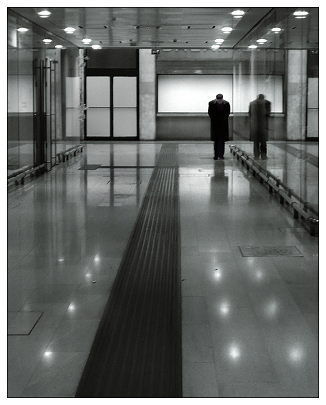 L'uomo è forse fermo, lì in fondo, immerso in questa atmosfera fredda, con queste luci di ghiaccio e questa scena così asettica.. dove l'unica presenza umana, viva, pulsante, è proprio quell'omino in fondo.. anzi, no.. non è l'unica.. ci siamo anche noi, in piedi, di fronte a lui, ad osservare il tutto.. con questa linea scura sul pavimento, che porta lo sguardo fino in fondo, e con calma ce lo fa riscoprire lì, riflesso uno, due, tre volte, ma sempre solo, unico, isolato dal resto..