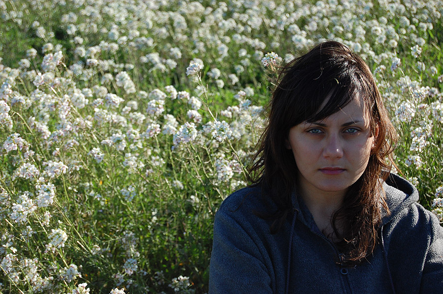 Un fiore o-scuro, (non solo a causa della luce ma anche a motivo dell'espressione pensierosa) su uno sfondo chiaro con tanti fiori bianchi.