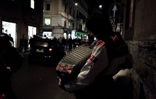 Mi pare che l'intenzione fosse di contrapporre il "passeggio" notturno e festaiolo al lavoro serale del fisarmonicista, e trovo il lato dx dell'immagine ben risolto. Ma c'è anche troppa confusione e poca leggibilità nel resto della foto, con punti luce sparsi.