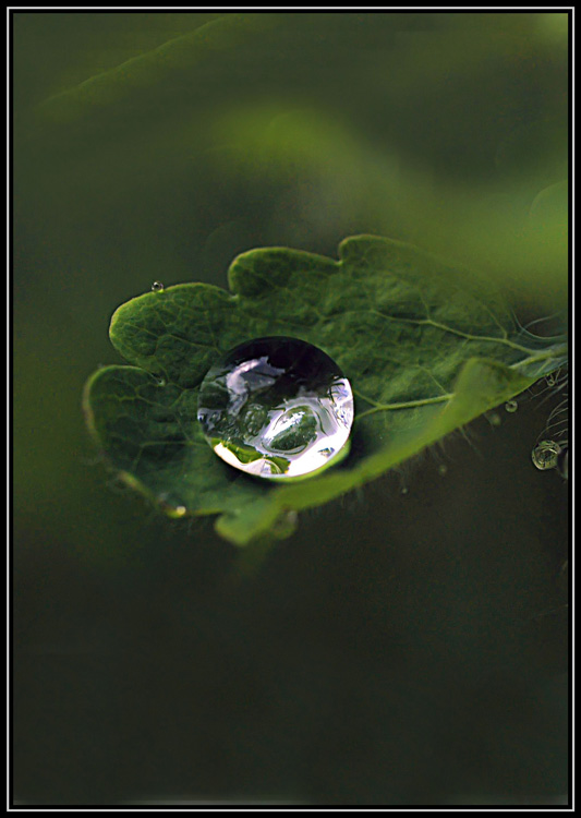 La foglia che grazie alla sua curiosa forma ma anche alla sfocatura della diaframmatura è qui resa così percettibilmente morbida sembra assumere la forma di una mano che interrompe la caduta di questa goccia d'acqua che deve essergli sembrata (con giusta causa) una perla di luce e vita.
