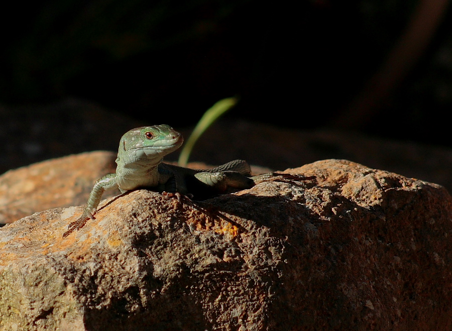 Buona ripresa del primo piano della lucertolina e del sasso, entrambi a fuoco. Peccato per quel filo verde ...
