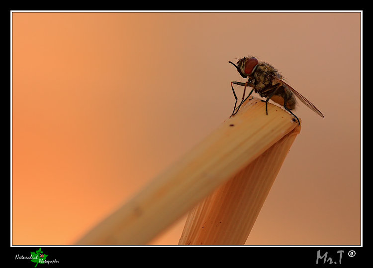 Nonostante non mi piacciano le mosche, la trovo deliziosa forse per l'originalità della posa, per il colore del tramonto così avvolgente,per la semplicità dell'immagine. Molto bravo come sempre.