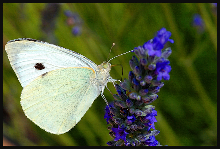 Macro dai bei colori, tenui della farfalla fino al blu intenso dei fiori, buona maf e sfocato, complimenti