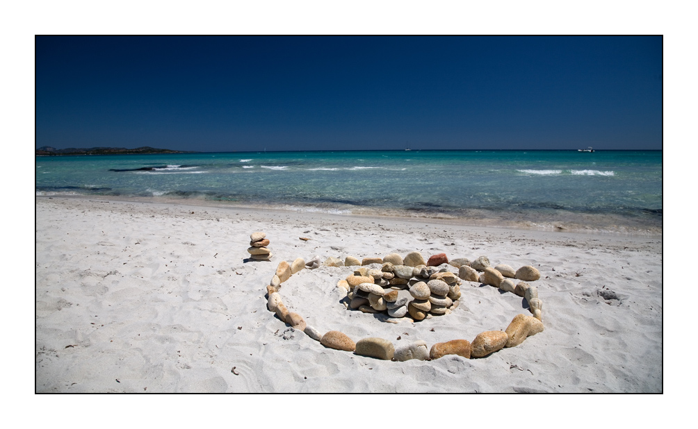 ....hai creato dal nulla un punto di interesse......le pietre così sistemate offrono all'occhio dell'osservatore quel punto fisso di cui ha bisogno.... purtroppo l'artificiosità del manufatto si contrappone al paesaggio e la costruzione un po forzata appare subito evidente, l'immagine non riesce a reggere solo su questa costruzione un po debole.... Gran sensazione di caldo pressante restituita anche dai toni della sabbia un po tendente al magenta..... piccolo appunto sull'orizzonte, di per se un po bombato, tende un poco a cadere verso sinistra.....
