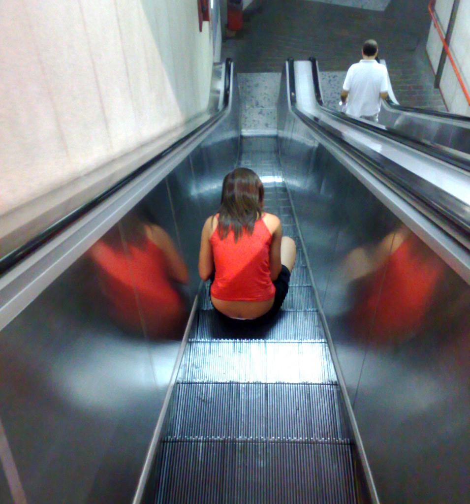 rafforza l'idea di lei seduta e ferma sulle scale mobili.
