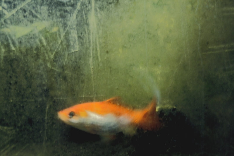 Quello che si vede è quello che ho visto io, un pesce rosso in un grande acquario da casa tenuto non molto bene per cui alghe in sospensione nell'acqua, vetro rigato e sporco, stanza buia unica illuminazione la luce dell'acquario....