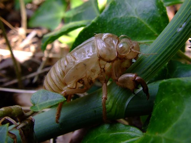sapete cos'è, questo è il bozzolo da cui è fuoriuscita la cicala,quando è in questo stato sta' sottoterra e si nutre di radici,quando è il momento esce terreno il momento + opportuno e la notte,si arrampica su di un tronco o dove gli viene + comodo si blocca con le possenti pinze e durante la notte avviene la trasformazione,sul guscio nella parte superiore c'è una apertura da li esce pino piano il nuovo soggetto, in pratica come il bruco quando si trasrorma in farfalla,e come esso quelle due piccole ali laterali si stendono e si allargano e man mano asciugano,la trasformazione dura tuttala notte l'indomani allo spuntar del sole la cicala e bella e pronta x affrontare la stagione,una cosa ho dimenticato quando econo dal bozzolo sono o di colore rosa,o verdi (ho visto di persona questo tipo di trasformazione x questo sono cosi' informato),ma lindomani li troverete tutte dello stesso colore.marroncino scuro.