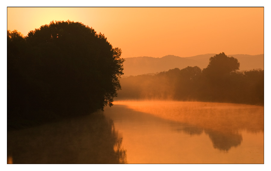 Atmosfera calda calda. Un arancio diffuso trimbra tutto il fotogramma. Bello l'effeto della nebbiolina che si stacca dalle acque.