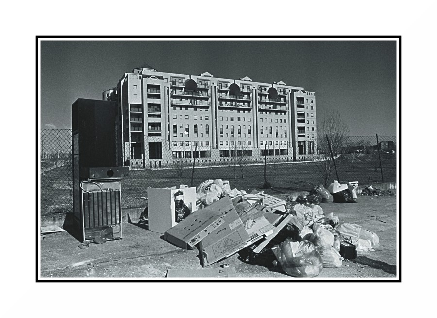 Un palazzone in stile post-modern vagamente pretenzioso è lo sfondo di questa realtà urbana; l'immagine nel suo insieme mi ricorda quelle persone elegantissime che quando vanno in un bagno pubblico si "dimenticano" di tirare l'acqua...