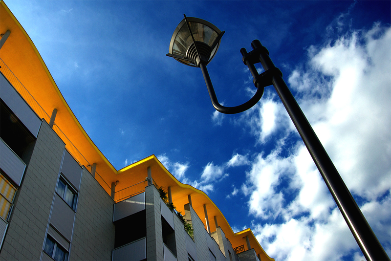 Per quanto riguarda la scelta dell'inquadratura, avrei fatto un leggero taglio in basso, per far partire quella linea della facciata proprio dall'angolo in basso a sinistra, e uno leggero relativo a destra, per far spuntare quel lampione da quello opposto..