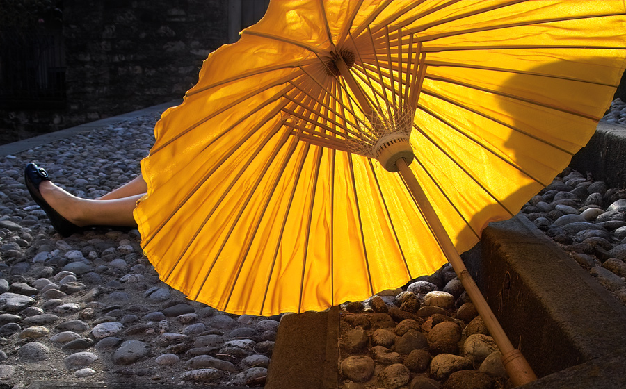 Ciao, il giallo è reso in maniera fantastica .. ma di ombre neanche l'ombra .. scherzi a parte, personalmente trovo che l'ombra sulla destra sia di troppo ovvero non si amalgami con la composizione rimanendo quindi come elemento di disturbo e credo che manchi invece l'ombra del corpo proprietario dei piedi che spuntano dietro l'ombrello cinese; mi sarebbe piaciuto vederne continuare il profilo dietro l'ombrello.