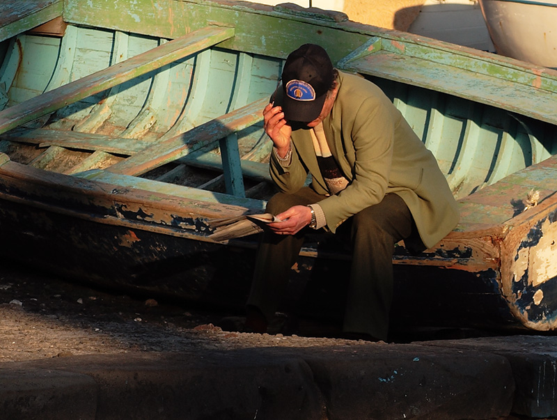 Molto bello il tuo commento, aggiungerei quello che mi ha colpito e spinto allo scatto; quell'uomo avanti negli anni seduto su una barca malandata legge delle preghiere da un foglietto. I marinai, in special modo i pescatori, sono molto religiosi. _________________ Cordialmente gio