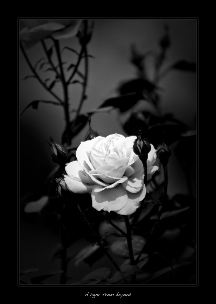 Anche la rosa in primo piano così illuminata si staglia bene. Buona la scelta del bianco e nero. Felice intuizione.