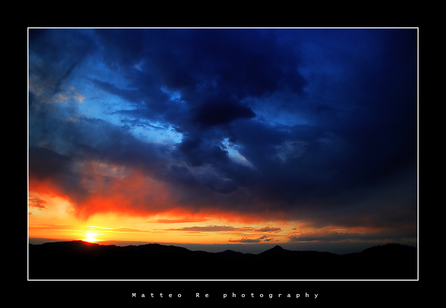 qui hai fatto davvero uno splendido lavoro.. perchè è stupenda quella specie di vortice di nuvole che si avvolgono quasi intorno al disco rosso del sole, mentre la luce infuoca quella zona, e in alto la luce fredda del blu fa da padrona, in un contrasto unico e magico, quasi da mettere i brividi, in una scena in cui si può apprezzare la grandezza e la bellezza della natura, e la piccolezza dell'uomo che la osserva..