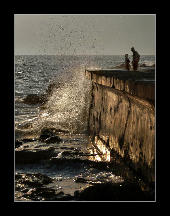 La luce violenta come l'onda che s'infrange rumorosamente silenziosa nel fotogramma muto che è una fotografia... e come se lo sapessero i due sono impassibili di fronte alla dinamicità dell'acqua... una foto che fa sognare.