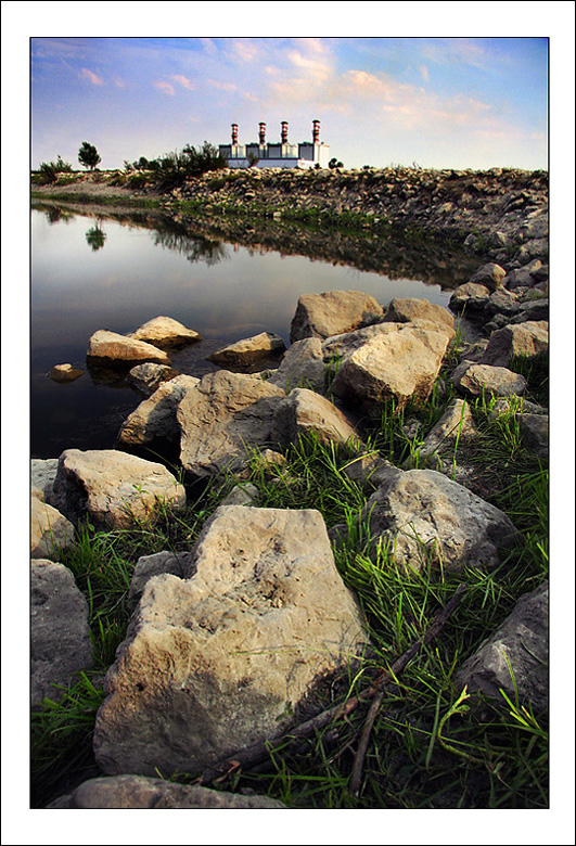 La composizione ed il taglio non sono male, però, in effetti, stando al titolo, la centrale mi sembra troppo piccola per essere il punto di interesse della foto, così come un po' invadenti sono i massi in primissimo piano che rubano la scena al soggetto.
