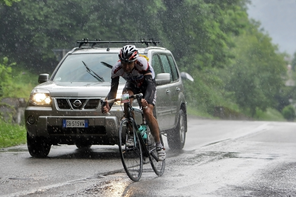 ottima, vista la giornata, la pioggia che tratteggia la foto è suggestiva, il ciclista congelato fotograficamente ed a fuoco però un po al buio....