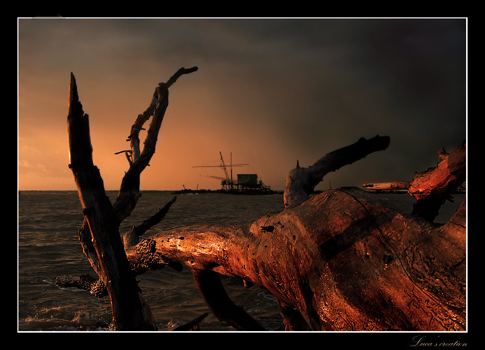 Hai immortalato una luce spettacolare e suggestiva con un cielo che digrada dalla luce alle tenebre delle nuvole e questo tronco molto ben dettagliato che da un che di inquietante.