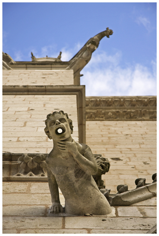 Immagine interessante di quello che mi sembra capire sia un gargoyles.. mi piace molto la scelta dell'inquadratura, abbastanza dal basso per dare visione del foro nella bocca dell'elemento e anche della muratura e di parte del cielo presente nella scena..