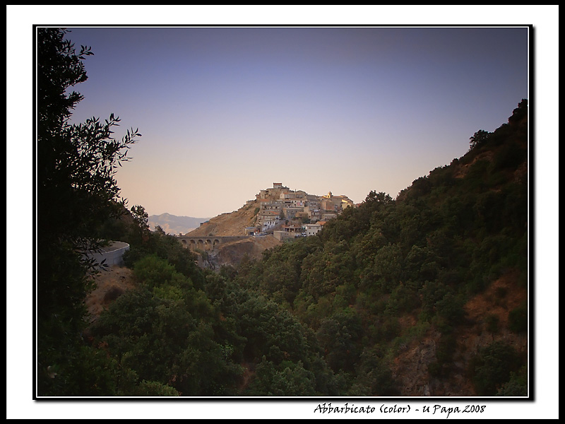 La scena, realmente, era fantastica! Mi piaceva l'idea di quel paesello che si ergeva da quel cucuzzolo, il tutto visto attraverso una cornice naturale, le due diagonali date dalla piccola valle in primo piano. Non ho neanche fatto caso alla strada di sinistra durante la lavorazione della foto, figurati se l'ho vista in fase di scatto!!!