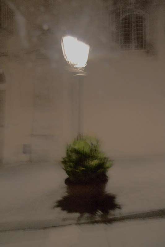Compositivamente il soggetto si trova eccessivamente al centro del fotogramma banalizzando un poco la realizzazione. Un taglio atto a decentrare il soggetto,magari spostandolo verso sinistra, avrebbe eliminato parte dell’architettura che ora restituisce un vago senso di ribaltamento dello sfondo. Il mosso, deciso ed evidente dato il luminoso soggetto, mi lascia un poco perplesso…dubitando che fosse il lampione a muoversi, direi che chi si è mosso sia stato tu ( quindi la macchina fotografica) ma in alcune parti il mosso è meno evidente che in altre… insomma mi pare che sia un mosso artificiale, aggiunto in post….ma, oltre al fatto che potrei anche sbagliarmi in questa analisi, potrei anche dire che nessuno vieta di farlo. Il passaggio in post comunque appare un po marcato, l’effetto grana-virata un poco appesantisce la lettura dell’immagine che già non risulta semplice di suo.