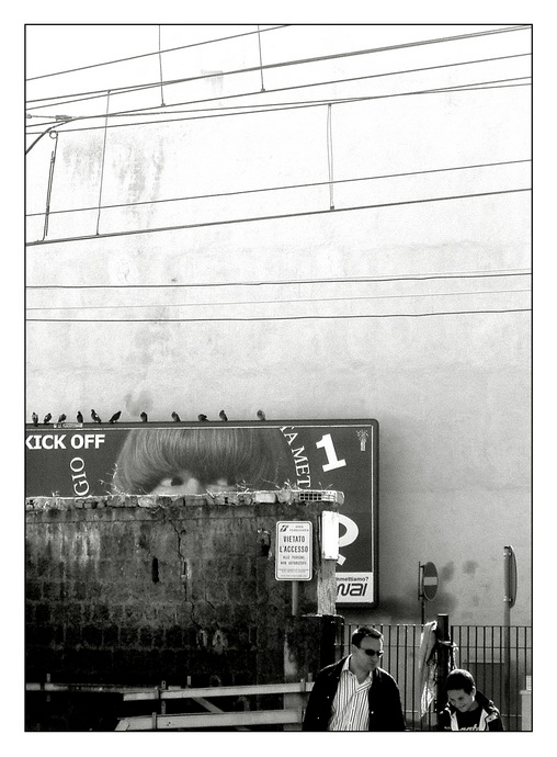 sai, ho dovuto pazientare un pò di minuti in questo posto (è un tratto del passaggio a livello e aspettavo ke venisse la mia ragazza) quindi me la sono " studiata" abbastanza la situazione.. in un primo momento volevo riprendere solo la parte superiore, sarebbe solo il muro e il cartellone invadente:quei piccioni tranquilli..quello sguardo, l'erbetta sul muro, mi davano l'impressione di uno appostato ke sbirciasse in un posto proibito (il divieto d'accesso)..