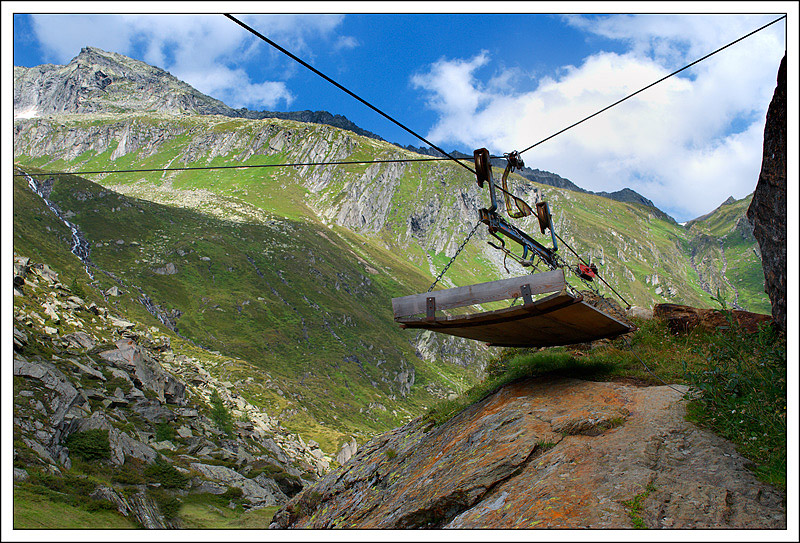 Passeggiando per la Valle Aurina ho avuto questo incontro ravvicinato con questa teleferica. Molti escursionisti passavano sotto di essa senza osservarla. Vista la sua importanza ho ritenuto donarle un piccolo momento di popolarità...
