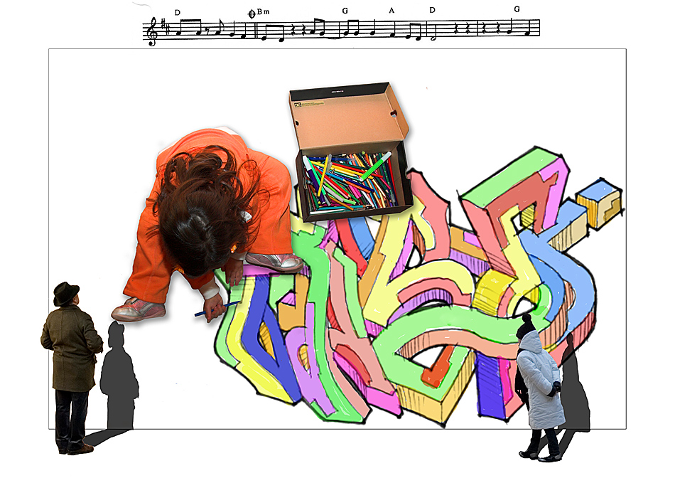 Qui hai inserito la musica, colonna sonora della vita; i colori con i quali siamo noi a colorarla, darle delle sfumature, calcare o meno la mano, sempre noi a colorare nello stesso verso o no; una bambina che dà sfogo alla sua creatività come soltanto i bambini possono fare, con quella loro spensieratezza ed ingenuità; ed infine due osservatori, un uomo ed una donna, che ognuno a proprio modo osserva la scena, chi con interesse, chi con curiosità. Magari uno comprende, l'altro un pò meno.