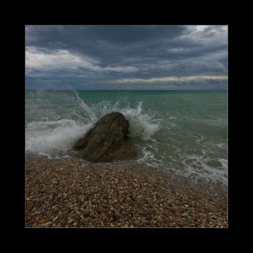 Amico Ueda, ho visto nella tua galleria che prediligi colori scuretti e una certa sottoesposizione ma questa mi sembra troppo ... ecco il mio contributo che riguarda anche la cornice; la foto si centra a mio parere sugli spruzzi e sul cielo assai imbronciato e si fa guardare, senza urletti di gioia ma con la calma dei miei anni ed il calore che viena dal mio amore per il mare.