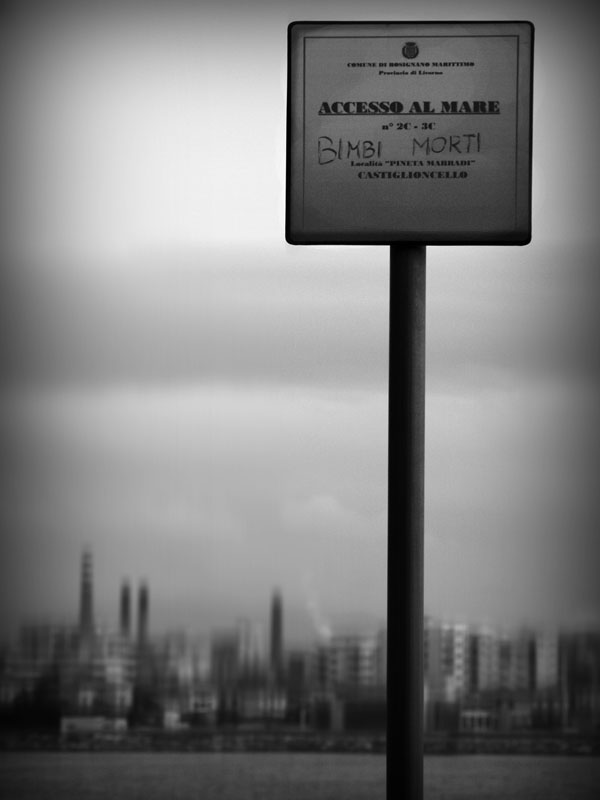 La scelta del bianco e nero consente di veicolare rapidamente l'attenzione sulla irragionevolezza del cartello ritratto: lasciando al contempo un enorme punto interrogativo determinato dalla presenza sullo sfondo di una realtà urbana oramai rarefatta ed asfitica.