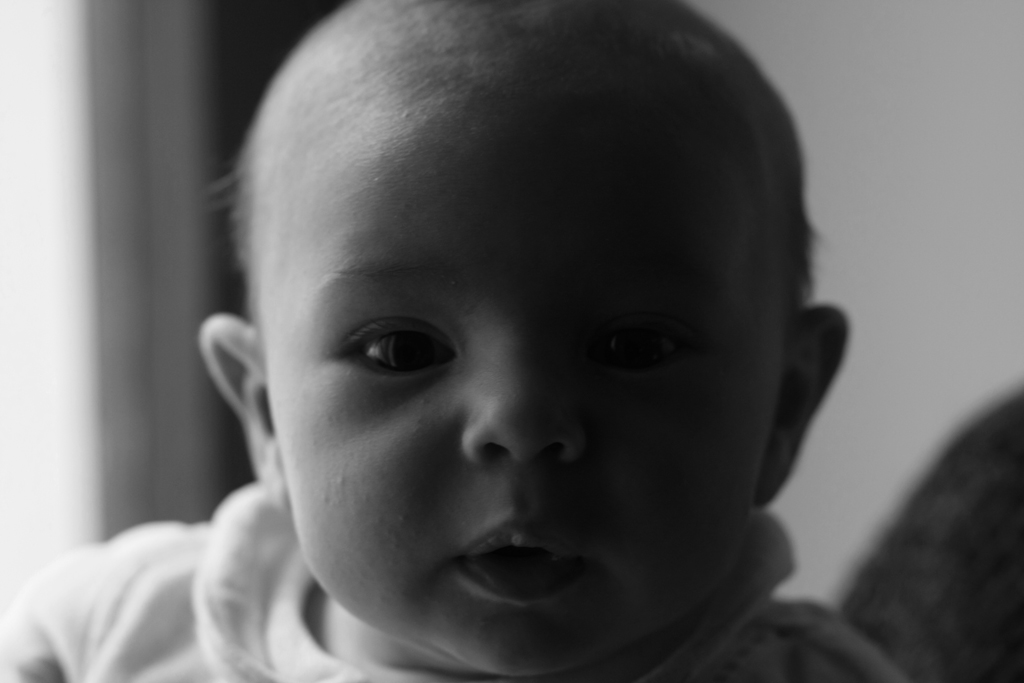 Il soggetto è molto tenero, con tutta evidenza, ma lo scatto risente della poca nitidezza complessiva. Inoltre la parte destra è davvero troppo buia: con un poco di accortezza in più (tanto il bimbo non scappava) potevi fare meglio.