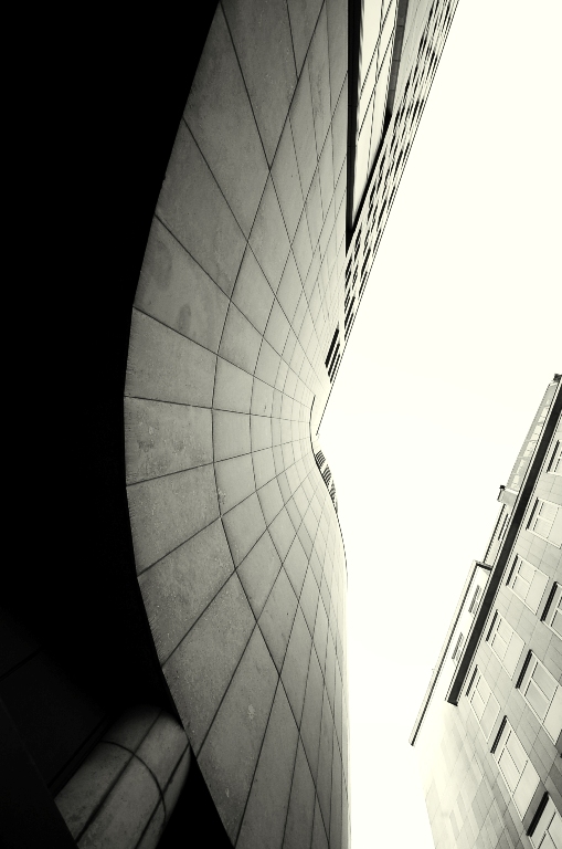 Mmmmm Sono un po' combattuto, di fronte a questa immagine.. perchè non so decidermi se mi piace o meno quel forte e intensissimo bianco che è presente in alto, nel cielo, e che si contrappone con la sua uniformità alla striscia di nero che si apre nella zona a sinistra, sotto al palazzo..