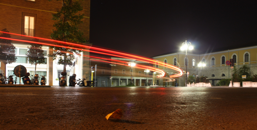 Ma tutti si sono soffermati a disquisire sull'importanza della foglia e del titolo, che a mio avviso è perentorio all'immagine, quello che nessuno per ora ha sottolineato e che a mio avviso fa la differenza visiva e l'interesse peculiare di questo scatto è l'altezza da terra da cui si trovano le strisciate lasciate dai fari degli automezzi.