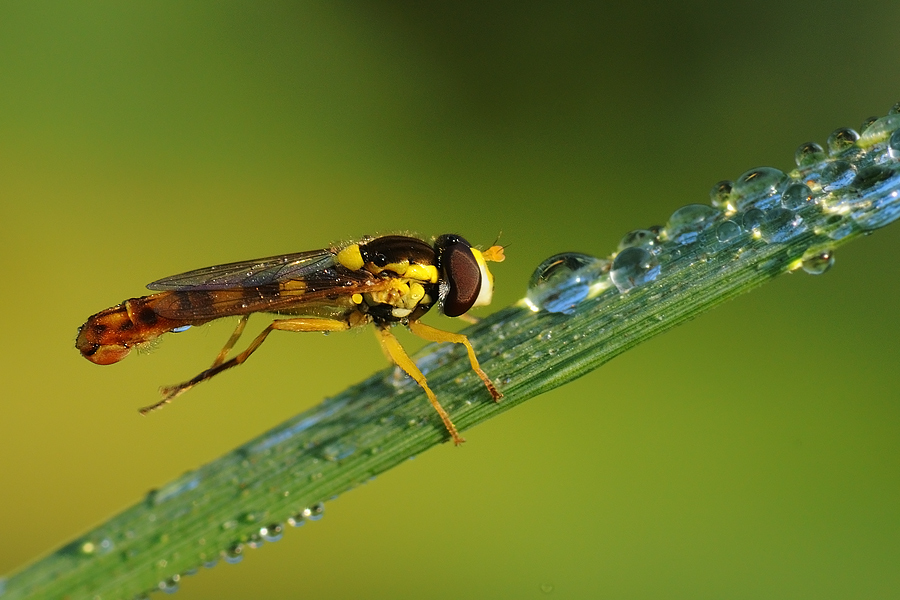 Bravo per averla immortalata mentre si pulisce le zampine posteriori. Molto buona la maf sulla sirfide e sulle gocce che meritavano la dovuta attenzione. Validi lo sfondo e la composizione. Noto una leggera dominante gialla.
