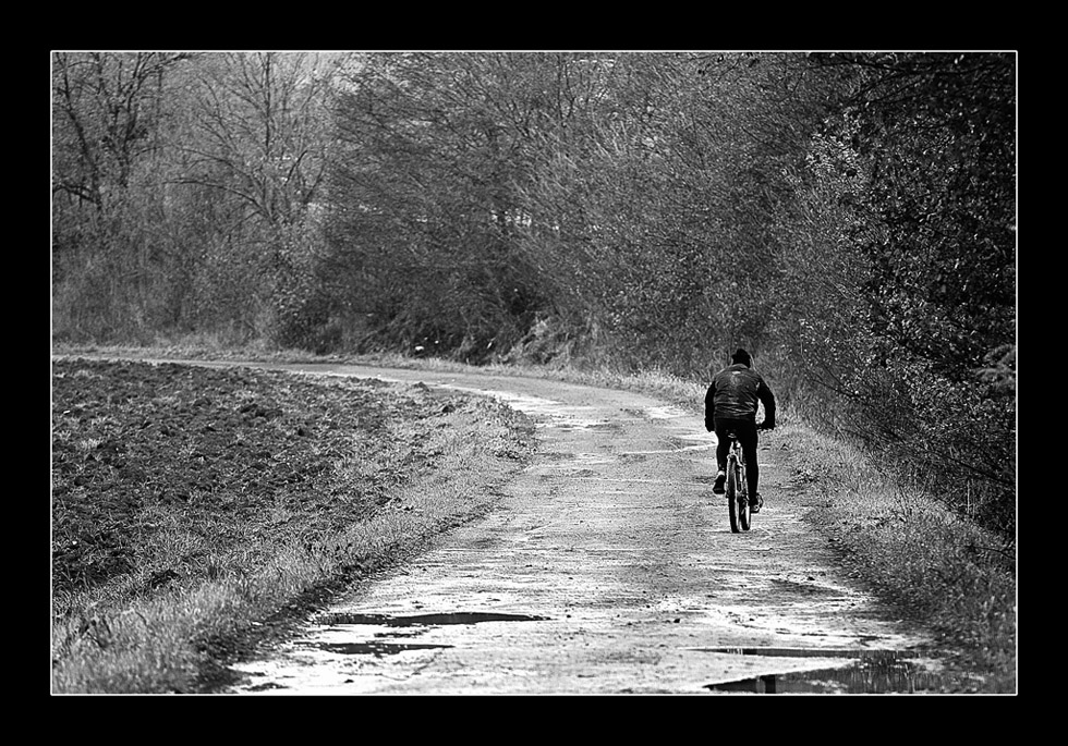 Bellissimo bianco e nero con luci e ombre ben gestite, forse un pò troppo morbida sugli alberi e un pò troppo dura sul ciclista.
