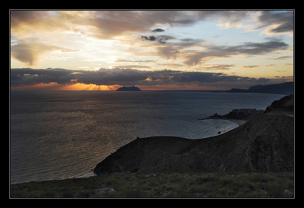 E' un'immagine che giudico imponente, la luce all'orizzonte è semplicemente spettacolare, il mare è mesto, buona l'introduzione del terreno quasi a mo' di silouette, mi piace qesto digradare cromatico, davvero bravo