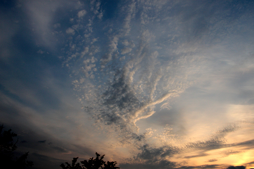 Bello questo tuo scatto al cielo con colori stupendi e con le nubi che formano delle geometrie magnifiche. Buona la gestione della luce. Particolarmente interessante la serie di nubi che si sprigiona al centro, sembra lo stappo di una bottiglia di spumante. Solo la cima di un albero nera in basso, a mio parere, interferisce con il resto dell'immagine. Complimenti , mi piace.