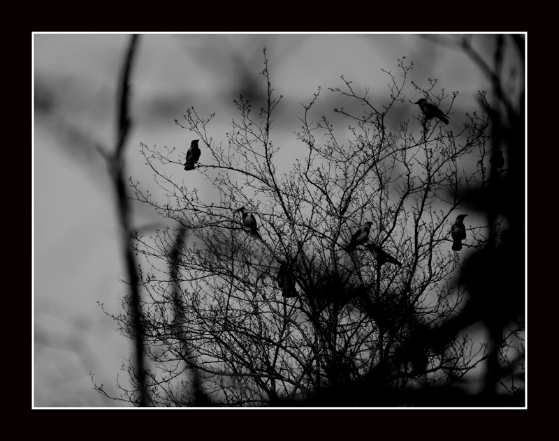 L'immagine è un po' upa si potrebbe dire, ma proprio per quello forse e per le ampie sfocature dei fuscelli in primo piano ci dà la senszione della presenza dell'inverno e di come questi uccelli radunati si preparano ad affrontare come meglio possono.